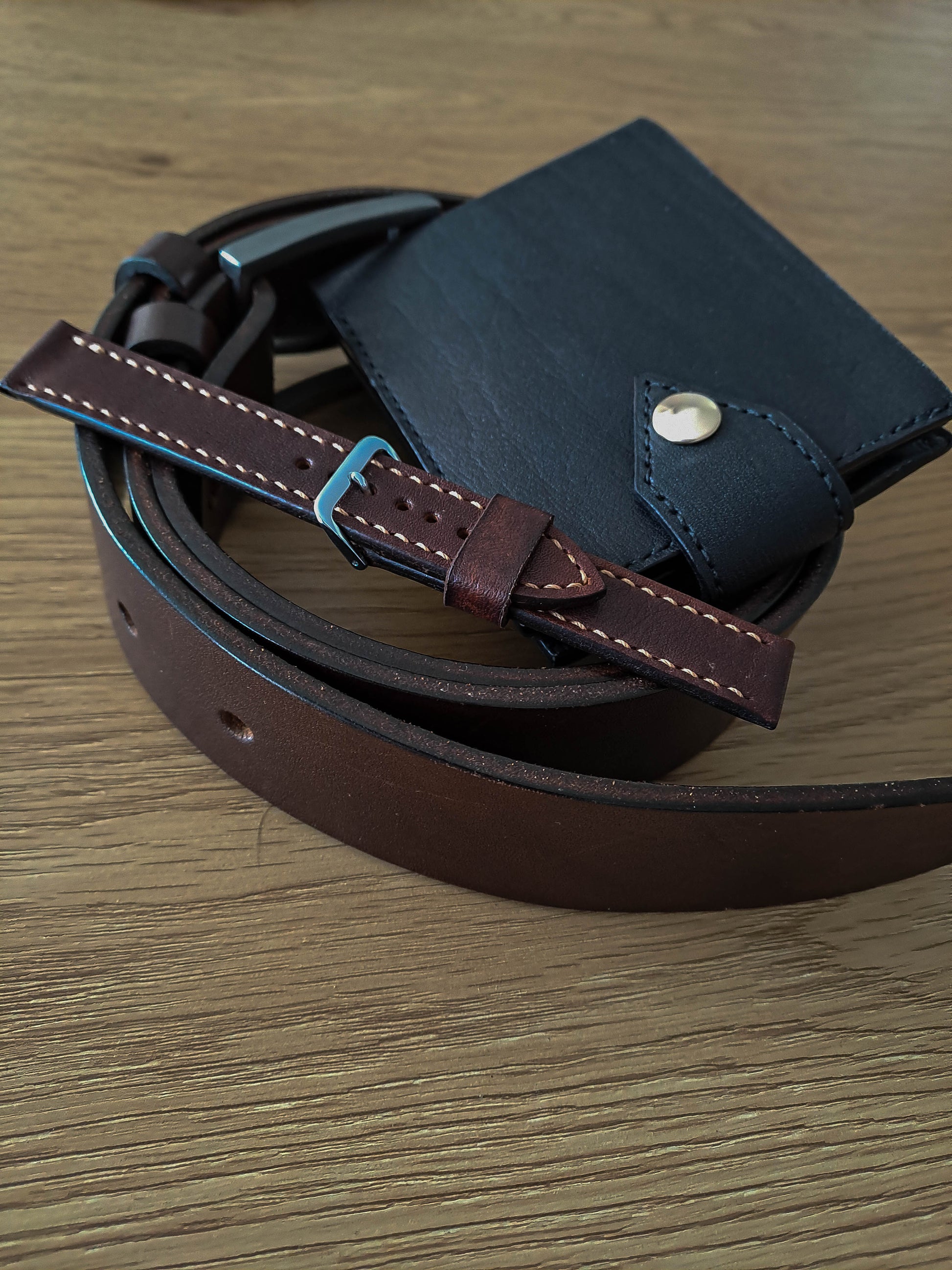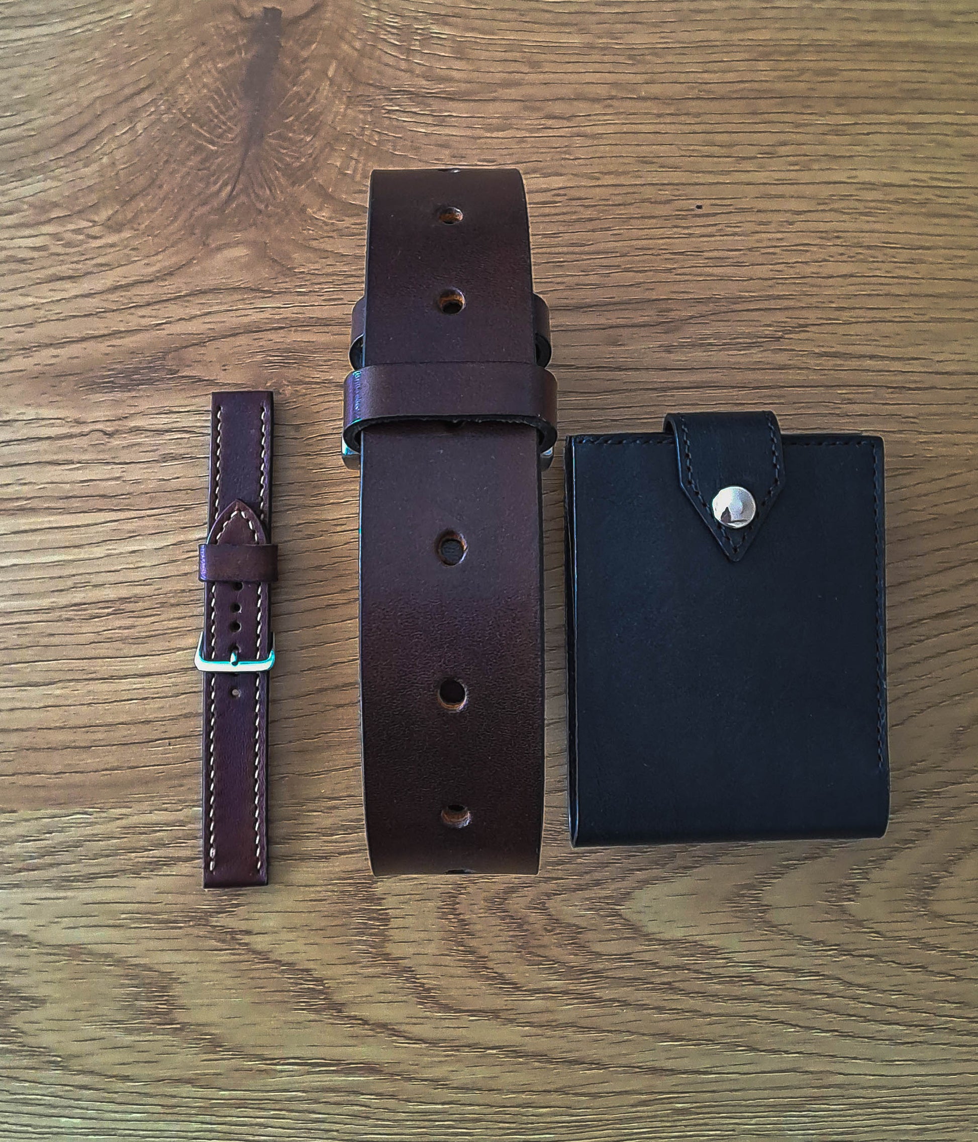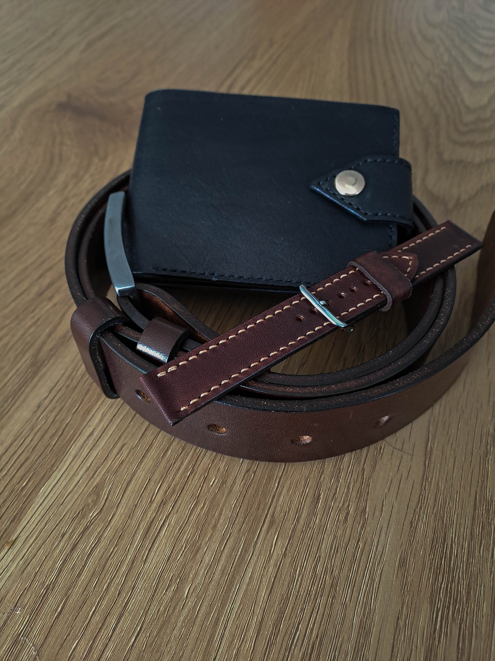 Cadoul perfect pentru tine sau cineva drag. Set 3 piese include un portofel din piele tabacita vegetal cu 9 buzunare card , unul pentru buletin. Cureau este Crupon de vita de 3.6 mm grosime si cu o lungime de 120 cm si latime 3.8 cm vopsita si lucrata manual. Cureau de ceas are latime de 2 cm si lungime standard 12x8.